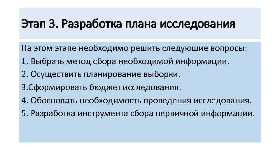 Этап 3. Разработка плана исследования На этом этапе необходимо решить следующие вопросы: 1. Выбрать метод сбора необходимой информации. 2. Осуществить планирование выборки. 3. Сформировать бюджет исследования. 4. Обосновать необходимость проведения исследования. 5. Разработка инструмента сбора первичной информации.