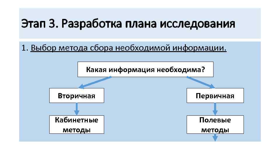 Этап 3. Разработка плана исследования 1. Выбор метода сбора необходимой информации. Какая информация необходима? Вторичная Первичная Кабинетные методы Полевые методы