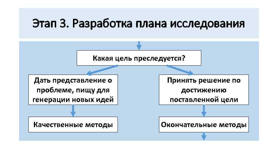Этап 3. Разработка плана исследования Какая цель преследуется? Дать представление о проблеме, пищу для генерации новых идей Принять решение по достижению поставленной цели Качественные методы Окончательные методы