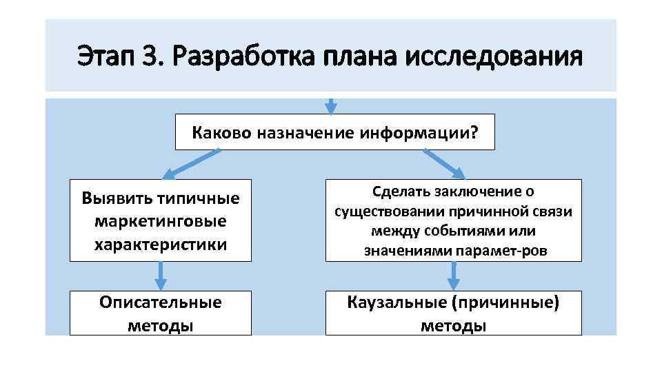 Этап 3. Разработка плана исследования Каково назначение информации? Выявить типичные маркетинговые характеристики Сделать заключение о существовании причинной связи между событиями или значениями парамет ров Описательные методы Каузальные (причинные) методы