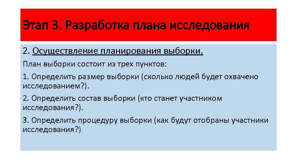 Этап 3. Разработка плана исследования 2. Осуществление планирования выборки. План выборки состоит из трех пунктов: 1. Определить размер выборки (сколько людей будет охвачено исследованием? ). 2. Определить состав выборки (кто станет участником исследования? ). 3. Определить процедуру выборки (как будут отобраны участники исследования? )