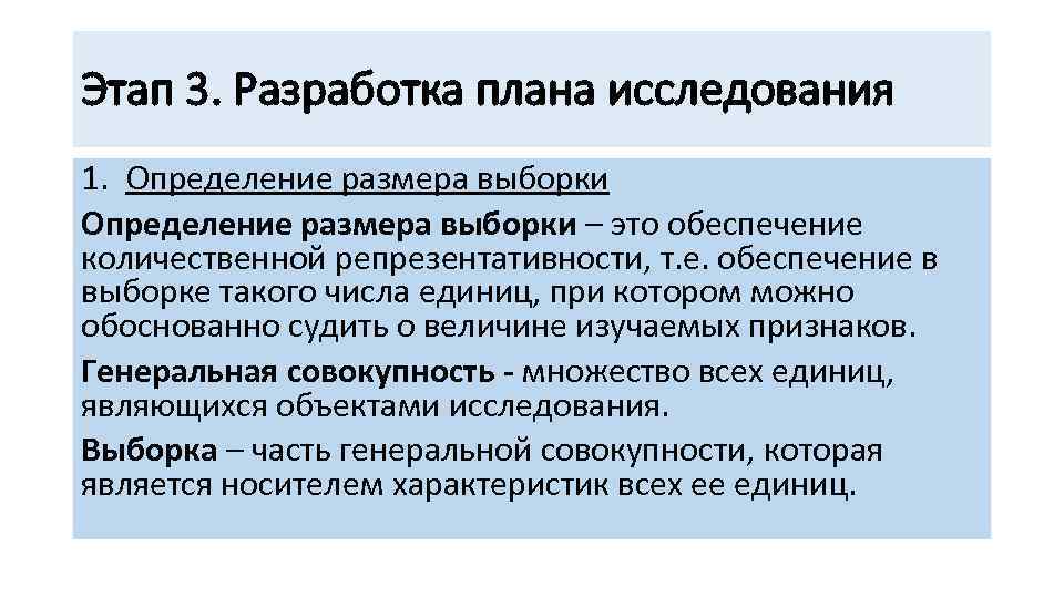 Этап 3. Разработка плана исследования 1. Определение размера выборки – это обеспечение количественной репрезентативности, т. е. обеспечение в выборке такого числа единиц, при котором можно обоснованно судить о величине изучаемых признаков. Генеральная совокупность множество всех единиц, являющихся объектами исследования. Выборка – часть генеральной совокупности, которая является носителем характеристик всех ее единиц.