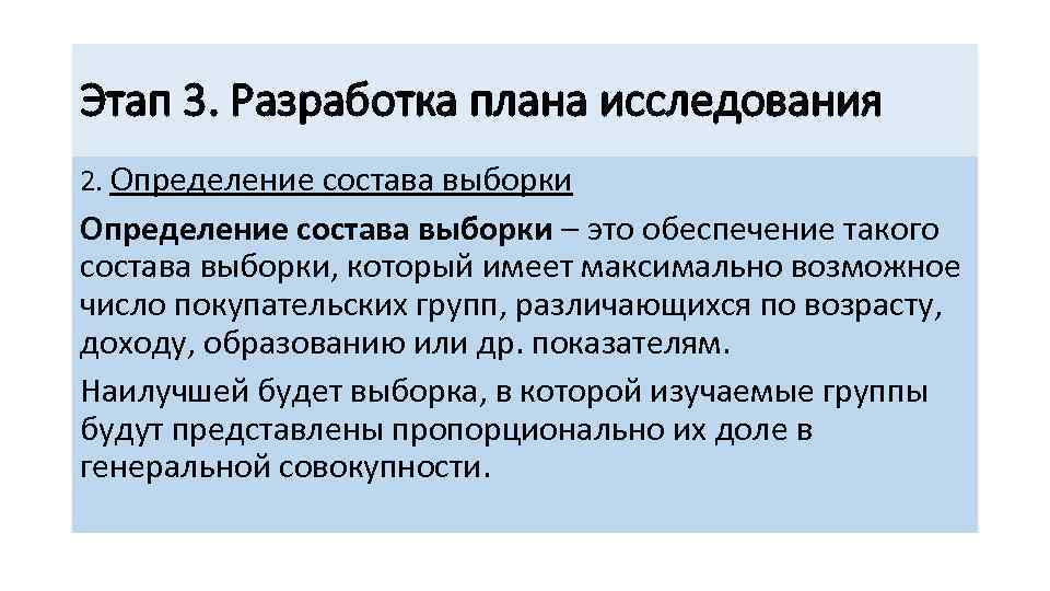 Этап 3. Разработка плана исследования 2. Определение состава выборки – это обеспечение такого состава выборки, который имеет максимально возможное число покупательских групп, различающихся по возрасту, доходу, образованию или др. показателям. Наилучшей будет выборка, в которой изучаемые группы будут представлены пропорционально их доле в генеральной совокупности.