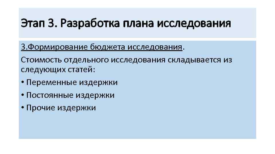 Этап 3. Разработка плана исследования 3. Формирование бюджета исследования. Стоимость отдельного исследования складывается из следующих статей: • Переменные издержки • Постоянные издержки • Прочие издержки