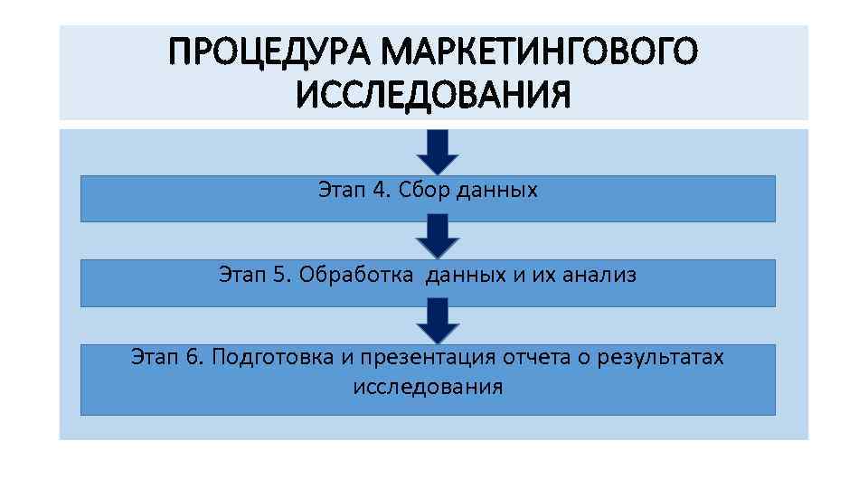 ПРОЦЕДУРА МАРКЕТИНГОВОГО ИССЛЕДОВАНИЯ Этап 4. Сбор данных Этап 5. Обработка данных и их анализ Этап 6. Подготовка и презентация отчета о результатах исследования