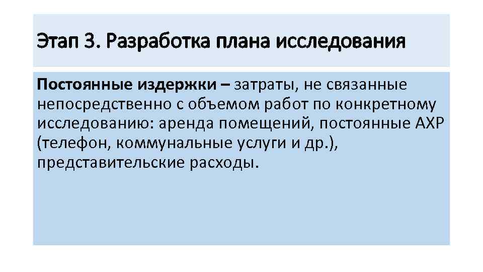 Этап 3. Разработка плана исследования Постоянные издержки – затраты, не связанные непосредственно с объемом работ по конкретному исследованию: аренда помещений, постоянные АХР (телефон, коммунальные услуги и др. ), представительские расходы.