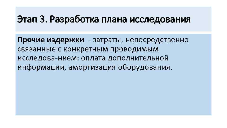 Этап 3. Разработка плана исследования Прочие издержки затраты, непосредственно связанные с конкретным проводимым исследова нием: оплата дополнительной информации, амортизация оборудования.