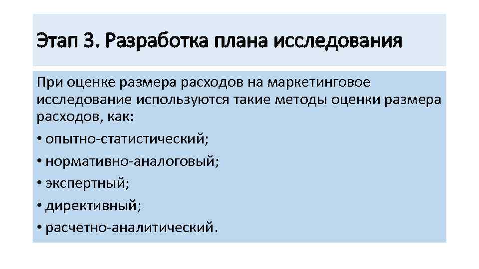 Этап 3. Разработка плана исследования При оценке размера расходов на маркетинговое исследование используются такие методы оценки размера расходов, как: • опытно статистический; • нормативно аналоговый; • экспертный; • директивный; • расчетно аналитический.