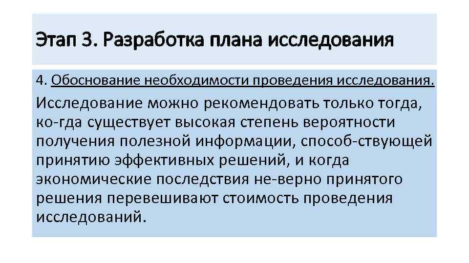 Этап 3. Разработка плана исследования 4. Обоснование необходимости проведения исследования. Исследование можно рекомендовать только тогда, ко гда существует высокая степень вероятности получения полезной информации, способ ствующей принятию эффективных решений, и когда экономические последствия не верно принятого решения перевешивают стоимость проведения исследований.
