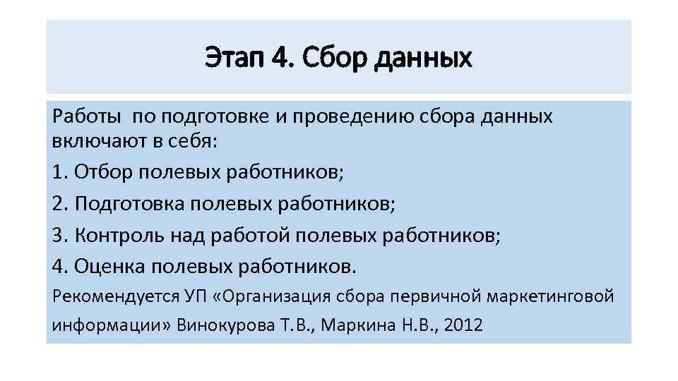 Этап 4. Сбор данных Работы по подготовке и проведению сбора данных включают в себя: 1. Отбор полевых работников; 2. Подготовка полевых работников; 3. Контроль над работой полевых работников; 4. Оценка полевых работников. Рекомендуется УП «Организация сбора первичной маркетинговой информации» Винокурова Т. В. , Маркина Н. В. , 2012