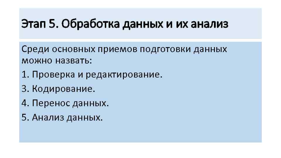 Этап 5. Обработка данных и их анализ Среди основных приемов подготовки данных можно назвать: 1. Проверка и редактирование. 3. Кодирование. 4. Перенос данных. 5. Анализ данных.