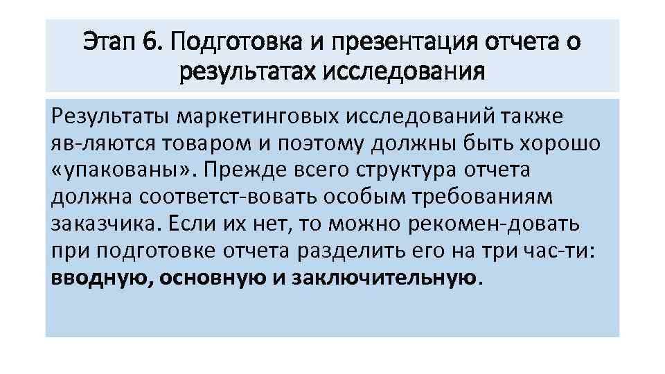 Этап 6. Подготовка и презентация отчета о результатах исследования Результаты маркетинговых исследований также яв ляются товаром и поэтому должны быть хорошо «упакованы» . Прежде всего структура отчета должна соответст вовать особым требованиям заказчика. Если их нет, то можно рекомен довать при подготовке отчета разделить его на три час ти: вводную, основную и заключительную.