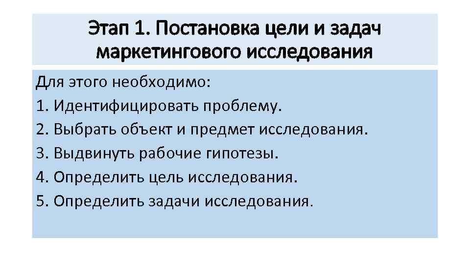 Этап 1. Постановка цели и задач маркетингового исследования Для этого необходимо: 1. Идентифицировать проблему. 2. Выбрать объект и предмет исследования. 3. Выдвинуть рабочие гипотезы. 4. Определить цель исследования. 5. Определить задачи исследования.