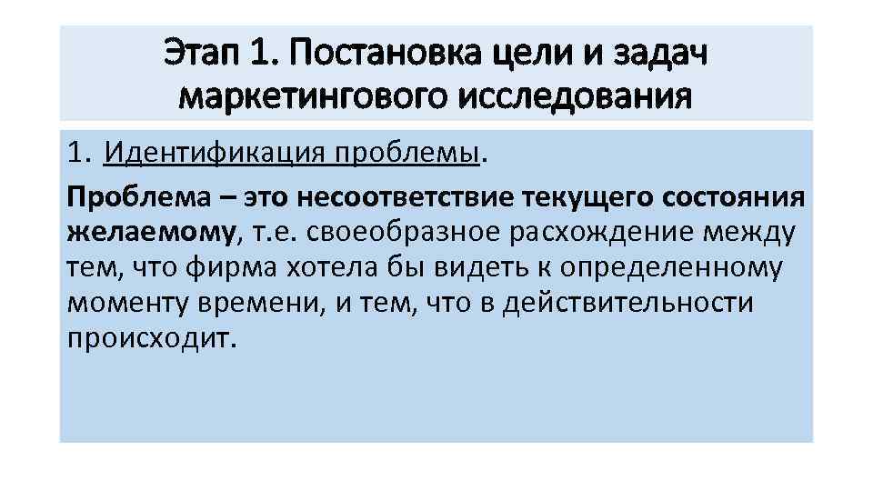Этап 1. Постановка цели и задач маркетингового исследования 1. Идентификация проблемы. Проблема – это несоответствие текущего состояния желаемому, т. е. своеобразное расхождение между тем, что фирма хотела бы видеть к определенному моменту времени, и тем, что в действительности происходит.