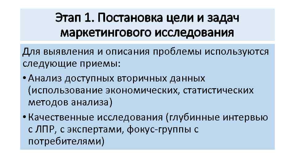 Этап 1. Постановка цели и задач маркетингового исследования Для выявления и описания проблемы используются следующие приемы: • Анализ доступных вторичных данных (использование экономических, статистических методов анализа) • Качественные исследования (глубинные интервью с ЛПР, с экспертами, фокус группы с потребителями)