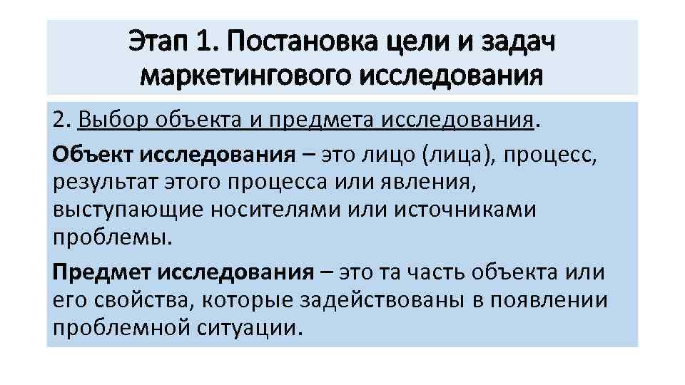 Этап 1. Постановка цели и задач маркетингового исследования 2. Выбор объекта и предмета исследования. Объект исследования – это лицо (лица), процесс, результат этого процесса или явления, выступающие носителями или источниками проблемы. Предмет исследования – это та часть объекта или его свойства, которые задействованы в появлении проблемной ситуации.