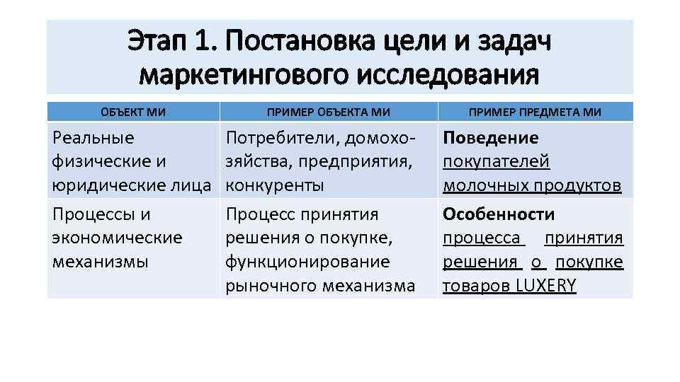 Этап 1. Постановка цели и задач маркетингового исследования ОБЪЕКТ МИ Реальные физические и юридические лица Процессы и экономические механизмы ПРИМЕР ОБЪЕКТА МИ Потребители, домохо зяйства, предприятия, конкуренты Процесс принятия решения о покупке, функционирование рыночного механизма ПРИМЕР ПРЕДМЕТА МИ Поведение покупателей молочных продуктов Особенности процесса принятия решения о покупке товаров LUXERY