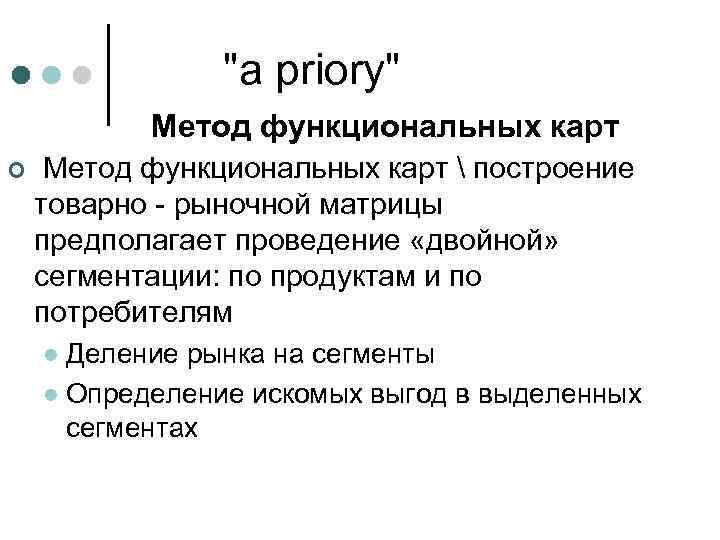 "а рriory" Метод функциональных карт ¢ Метод функциональных карт построение товарно - рыночной матрицы предполагает проведение «двойной» сегментации: по продуктам и по потребителям Деление рынка на сегменты l Определение искомых выгод в выделенных сегментах l