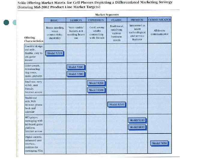 сегментации Nokia Сегменты рынка Характеристики Дети Красивый корпус, наличие игр Xserie s Многофункциональность телефона, наличие разнообразных приложений Уникальный дизайн, отличительная конструкция Активная молод ежь Nokia Cserie s Индивидуал исты "Модники " Консерватор ы "Богачи" Nokia 5000 series Nokia 6000 series Стиль телефона, известность модели Простота использования, надежность Имидж, престиж Все в одном. Nokia 700 0 seri es Nokia Nse ries Деловые люди Nokia Eseri es