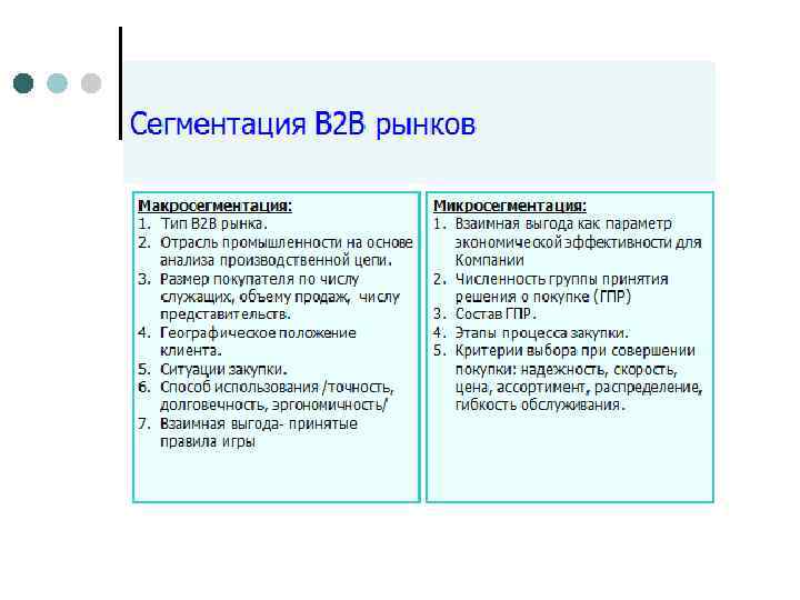 Методы сегментации ¢ Макросегментация - выделение базовых рынков l ¢ построения сетки сегментациинахождение базовых рынков Сегментация на базовом рынке l l сегментации по выгодам метод функциональных карт/ построение товарно-рыночной матрицы