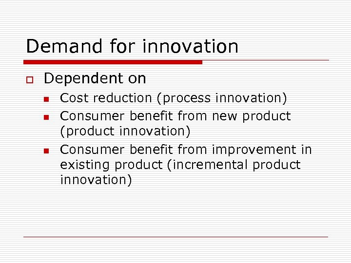 Demand for innovation o Dependent on n Cost reduction (process innovation) Consumer benefit from new product (product innovation) Consumer benefit from improvement in existing product (incremental product innovation)