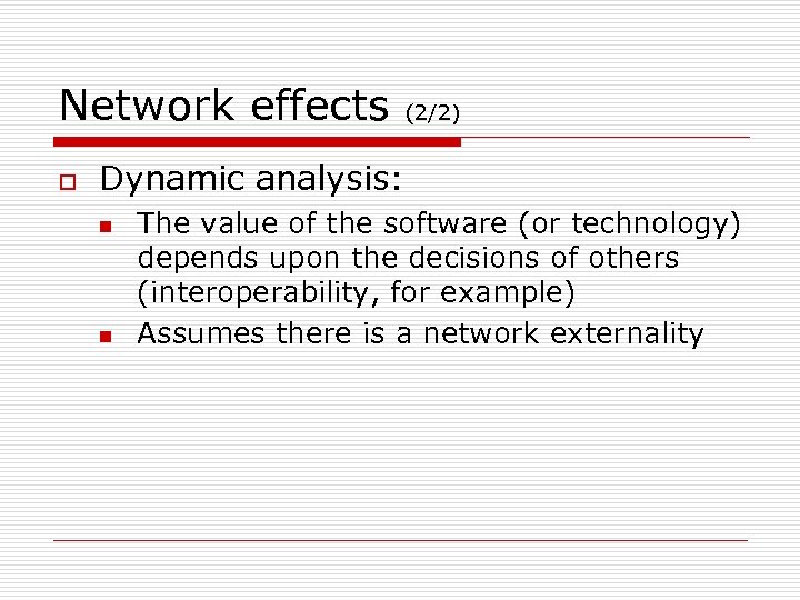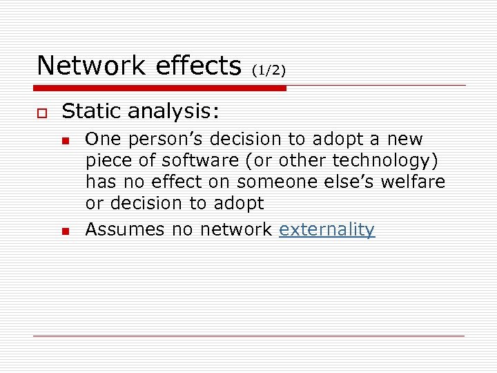 Network effects o (1/2) Static analysis: n n One person’s decision to adopt a new piece of software (or other technology) has no effect on someone else’s welfare or decision to adopt Assumes no network externality