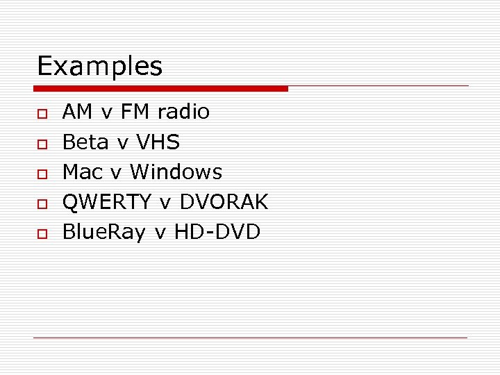 Examples o o o AM v FM radio Beta v VHS Mac v Windows QWERTY v DVORAK Blue. Ray v HD-DVD