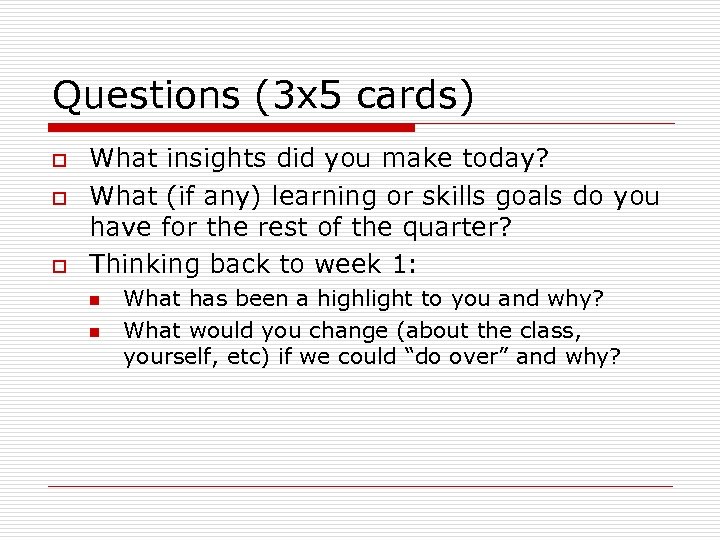 Questions (3 x 5 cards) o o o What insights did you make today? What (if any) learning or skills goals do you have for the rest of the quarter? Thinking back to week 1: n n What has been a highlight to you and why? What would you change (about the class, yourself, etc) if we could “do over” and why?
