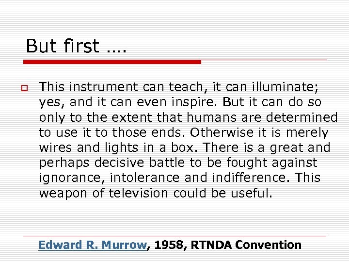 But first …. o This instrument can teach, it can illuminate; yes, and it can even inspire. But it can do so only to the extent that humans are determined to use it to those ends. Otherwise it is merely wires and lights in a box. There is a great and perhaps decisive battle to be fought against ignorance, intolerance and indifference. This weapon of television could be useful. Edward R. Murrow, 1958, RTNDA Convention