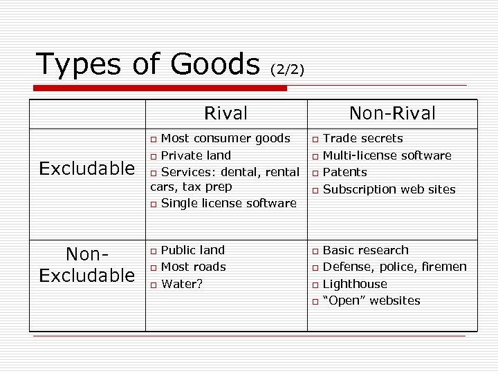 Types of Goods o o (1/2) Non-rival - a good that can be used by more than one person at the same time (an idea) Non-excludable - it is not possible for the “owner” to exclude others from consuming this good (non-patented idea)