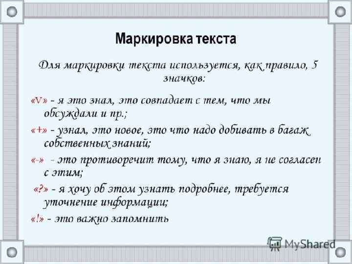 ЦЕЛИ И ЗАДАЧИ МАРКИРОВКИ ü ü пометками устанавливаются приоритеты, поскольку выделяются важные места; пометки помогают дополнительно структурировать текст (условные знаки); пометки облегчают нахождение и повторное прочте ниеважных мест текста; пометки способствуют тщательному обдумыванию и лучшему восприятию и запоминанию