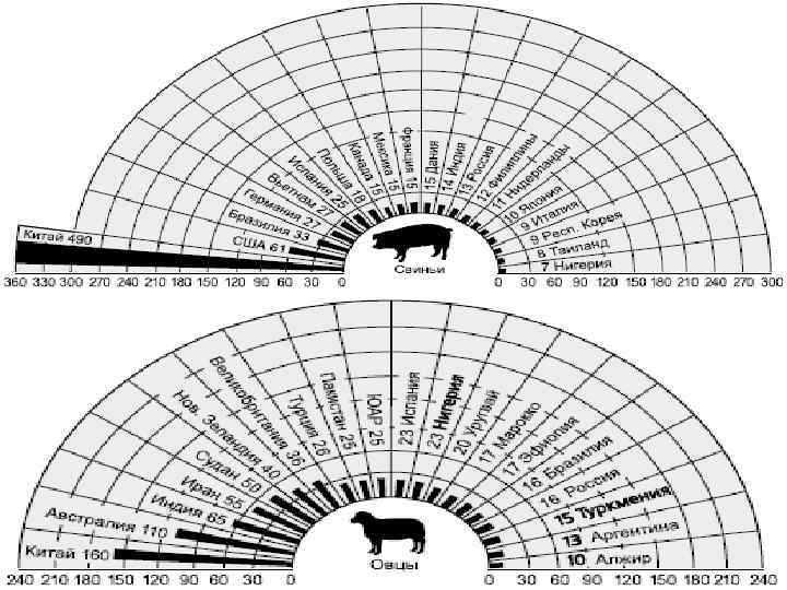 По количеству крупного рогатого скота • В Уругвае на 1000 жителей приходится в среднем 3200 голов, • В Ботсване, Намибии, Парагвае и Аргентине – 1700 голов. По поголовью овец • В Уругвай (8200), из расчета на 1000 жителей, • В Новой Зеландии (14 800). • В Монголии этот показатель составляет 6200, • В Мавритании – 2200, • В Намибии – 1800. По количеству свиней • В Дании (2100), на 1000 человек (мировой рекордсмен) • маленькие островные государства Океании – Тонга, Тувалу, Западное Самоа (1000– 1500).