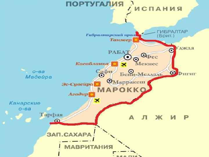 Полное официальное название — Королевство Марокко. Столица – Рабат. Площадь – 446600 км. кв. Денежная единица – дирхам. Государство на северо-западе Африки. Марокко — единственная африканская страна, которая на данный момент не является членом Африканского Союза(вышла из АС в 1984 году). Однако это государство входит в Лигу Арабских государств. Марокко на востоке и юговостоке граничит с Алжиром, на юге - с Западной Сахарой. Омывается на севере водами Средиземного моря и на западе – водами Атлантического океана. Гибралтарский пролив отделяет Марокко от материка Европы. На востоке и юго-востоке граничит с Алжиром, на юге - с Западной Сахарой. Юговосточная граница в пустыне Сахара точно не определена. Общая протяженность сухопутных границ -- 2 018 км. В том числе с такими странами как: Алжир -- 1 559 км, Западная Сахара -- 443 км. Страна делится на четыре физико-географических региона: Эр-Риф, или горный район, лежащий параллельно средиземноморскому побережью; Атласские горы, протянувшиеся через страну с юго-запада на северо-восток от Атлантического океана до Эр-Рифа, от которого их отделяет впадина Таза; регион обширных прибрежных равнин атлантического побережья; долины, лежащие на юг от гор Атласса, переходящие в пустыню. Высочайшая точка страны -- гора Джебель-Тубкаль (4165 м).