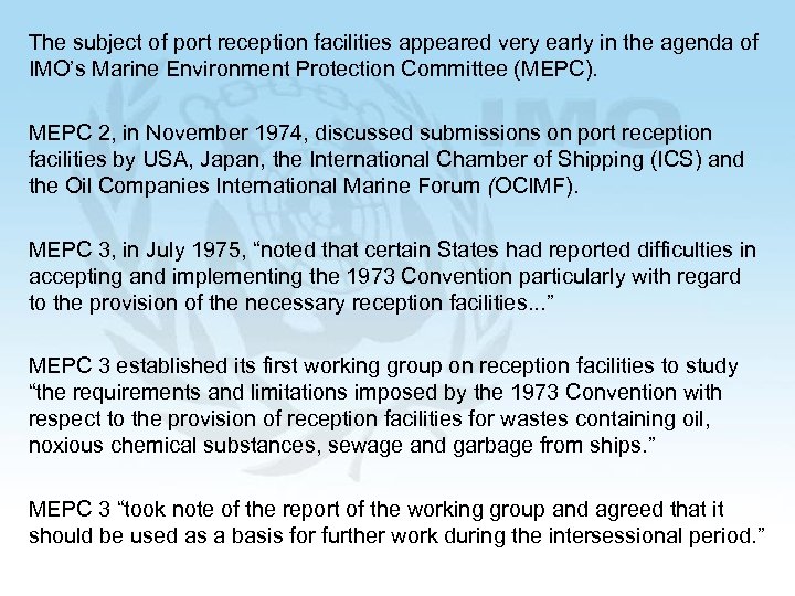 The subject of port reception facilities appeared very early in the agenda of IMO’s Marine Environment Protection Committee (MEPC). MEPC 2, in November 1974, discussed submissions on port reception facilities by USA, Japan, the International Chamber of Shipping (ICS) and the Oil Companies International Marine Forum (OCIMF). MEPC 3, in July 1975, “noted that certain States had reported difficulties in accepting and implementing the 1973 Convention particularly with regard to the provision of the necessary reception facilities. . . ” MEPC 3 established its first working group on reception facilities to study “the requirements and limitations imposed by the 1973 Convention with respect to the provision of reception facilities for wastes containing oil, noxious chemical substances, sewage and garbage from ships. ” MEPC 3 “took note of the report of the working group and agreed that it should be used as a basis for further work during the intersessional period. ”