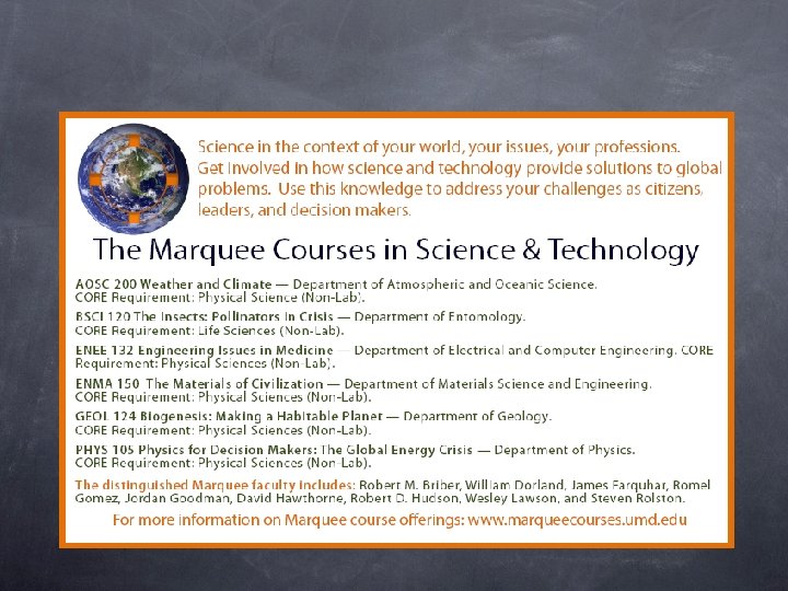 Marquee Science & Technology Courses A successful example of crossdisciplinary course development Jordan Goodman Department of Physics University of Maryland November 2009