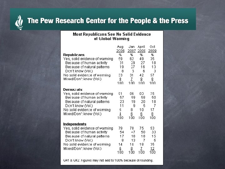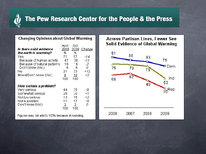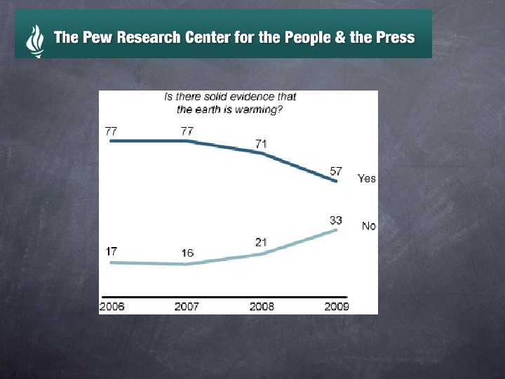 Students were asked: Why the trend? “The economy has displaced global warming from the news” “It’s the scientists fault for not being definitive enough” Why, since this is a scientific question, do the responses break down on party lines? Dems want green industries Republicans want to protect big business They get their news from different sources
