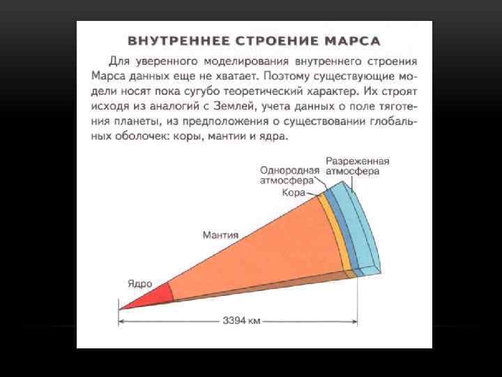 СТРОЕНИЕ МАРСА • Ядро Марса до 9% массы планеты. • Имеет мощную кору толщиной 100 км.