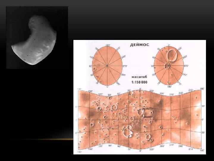 Фобос Деймос Радиус орбиты 9380 км 23460 км Период обращения 7 ч 40 мин 30 ч 19 мин Размеры (полуоси) 14 х 10 км 8 х 6 км