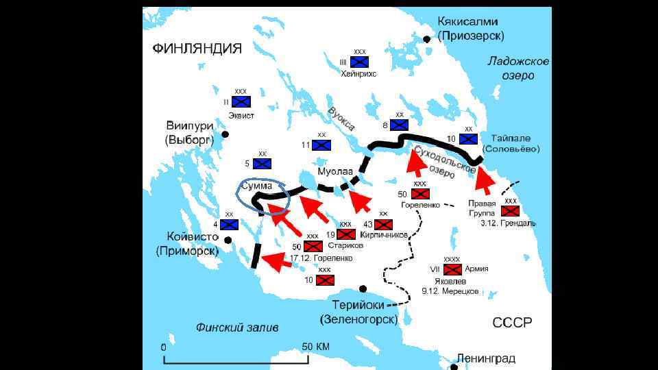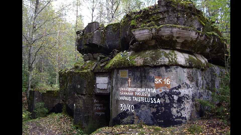 Линия Маннергейма (синим цветом на карте) Исаев А. В. Десять мифов Второй мировой: «Нигде в мире природные условия не были так благоприятны для постройки укрепленных линий, как в Карелии. На этом узком месте между двумя водными пространствами — Ладожским озером и Финским заливом — имеются непроходимые леса и громадные скалы. Из дерева и гранита, а где нужно — и из бетона, построена знаменитая линия Маннергейма. Величайшую крепость линии Маннергейма придают сделанные в граните противотанковые препятствия»