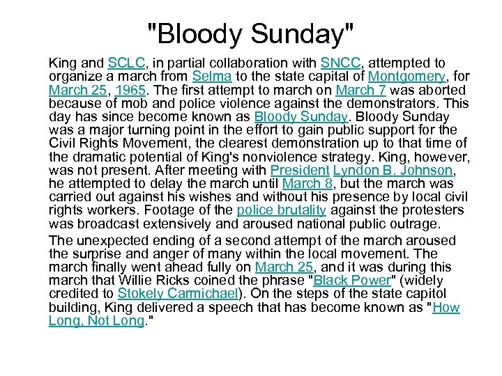 "Bloody Sunday" King and SCLC, in partial collaboration with SNCC, attempted to organize a march from Selma to the state capital of Montgomery, for March 25, 1965. The first attempt to march on March 7 was aborted because of mob and police violence against the demonstrators. This day has since become known as Bloody Sunday was a major turning point in the effort to gain public support for the Civil Rights Movement, the clearest demonstration up to that time of the dramatic potential of King's nonviolence strategy. King, however, was not present. After meeting with President Lyndon B. Johnson, he attempted to delay the march until March 8, but the march was carried out against his wishes and without his presence by local civil rights workers. Footage of the police brutality against the protesters was broadcast extensively and aroused national public outrage. The unexpected ending of a second attempt of the march aroused the surprise and anger of many within the local movement. The march finally went ahead fully on March 25, and it was during this march that Willie Ricks coined the phrase "Black Power" (widely credited to Stokely Carmichael). On the steps of the state capitol building, King delivered a speech that has become known as "How Long, Not Long. "