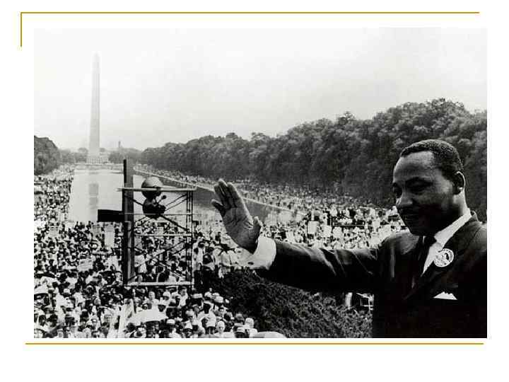 Мартин Лютер- великий оратор Широкую известность получила речь Мартина Лютера Кинга «У меня есть мечта» ( «I have a dream» ), которую во время марша на Вашингтон в 1963 году у подножья монумента Линкольну слушали около 300 тысяч американцев. В этой речи он восславил расовое примирение. Кинг заново определил суть американской демократической мечты и разжёг в ней новый духовный огонь. Роль Кинга в ненасильственной борьбе за принятие закона, уничтожавшего остатки расовой дискриминации, была отмечена Нобелевской премией мира. Как политик, Кинг являлся поистине уникальной фигурой. Излагая сущность своего лидерства, он оперировал главным образом религиозными терминами. Он определял руководство движением в защиту гражданских прав как продолжение прежней пастырской службы и использовал в большинстве посланий афроамериканский религиозный опыт. Согласно традиционному стандарту американских политических взглядов, он являлся лидером, верящим в христианскую любовь. Подобно множеству других ярких личностей американской истории, Кинг прибегал к религиозной фразеологии, тем самым вызывая восторженный духовный отклик у своей аудитории.