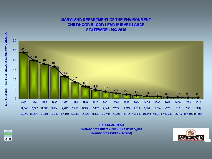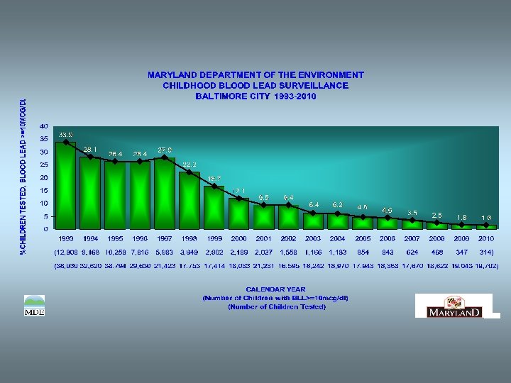 HOUSE BILL 1033 Department to conduct a study evaluating processes that reduce lead poisoning in affected and non-affected properties, to include rentals built from 1950 -1978 and owner occupied properties. • Workgroup of various members, including from state legislature, state agencies, Coalition to End Childhood Lead Poisoning, Maryland Association of Realtors, Maryland Property Owners Association, etc. • Will study current lead poisoning data relevant to affected and non-affected properties • Potential for expanding applicability of the law • MDE will report study to the General Assembly no later than December 31, 2011.