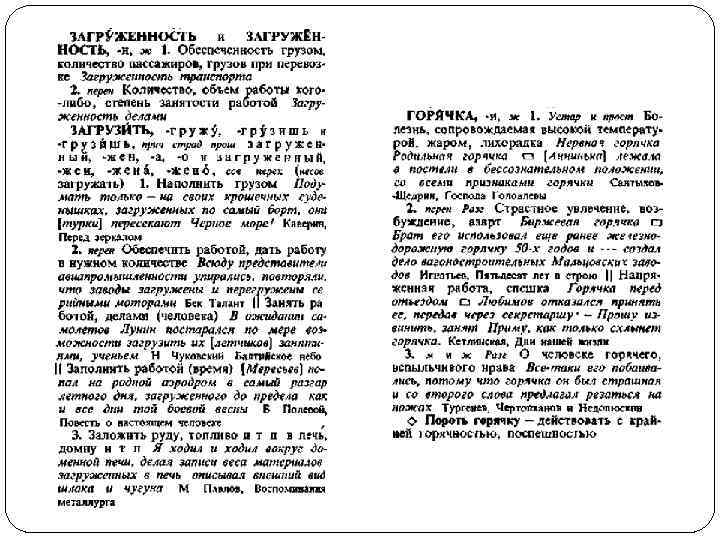 Структура словарной статьи В пределах словарной статьи представлены слово, в котором проставлено ударение, сведения о его грамматических формах (для существительных указан также род), принадлежности к той или иной части речи. Далее приводятся стилистические пометы и толкование слова с иллюстрирующими его значения примерами; смысловые оттенки значений выделяются с помощью знака ||. После знака | могут следовать сведения об особенностях употребления слова в одном из его значений (в частности, о субстантивации прилагательного или безличном употреблении глагола). За знаком ◊ приводятся фразеологические данные о слове, а в конце статьи иноязычного слова, с нового абзаца и в квадратных скобках — этимологическая справка.