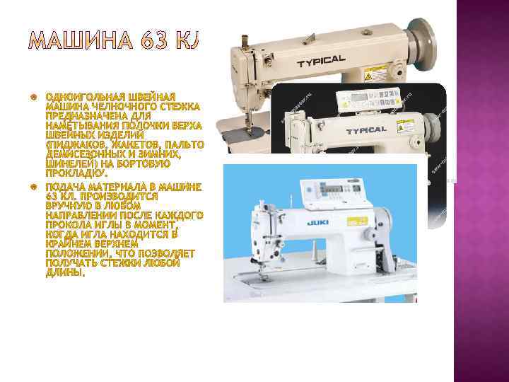 игла прямая, совершающая возвратно-поступательные движения в горизонтальной плоскости; шарнирнорычажный нитепритягиватель; ротационный челнок с вертикальной осью вращения, смонтированный в большом ролике подачи материала; механизм подачи два рифленых ролика, осуществляющие подачу материала только в прямом направлении и прерывистое движение с выстоем во время нахождения иглы в материале. Роликовая подача материала позволяет обрабатывать на машине материалы большой переменной толщины. В машине регулируются положение иглы относительно носика челнока, согласованность движений большого и малого роликов подачи, сила прижатия ролика к материалу и зазор между роликами, натяжение ниток иглы и челнока, длина стежка и время затягивания стежка.