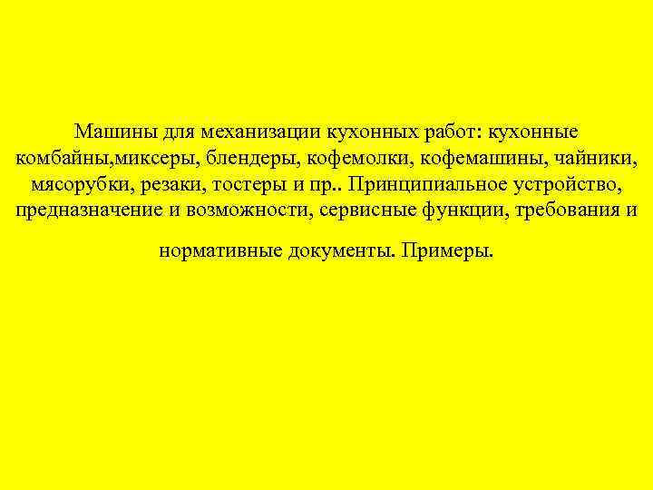 Машины для механизации кухонных работ: кухонные комбайны, миксеры, блендеры, кофемолки, кофемашины, чайники, мясорубки, резаки, тостеры и пр. . Принципиальное устройство, предназначение и возможности, сервисные функции, требования и нормативные документы. Примеры.
