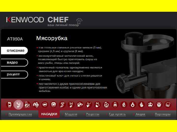 Насадки Насадка-овощерезка (шинковка), позволяет нарезать твердые овощи кружочками, кубиками и брусочками. Насадка Кеббе, предназначена для получения полых сосисок для последующего наполнения их фаршем и обжаривания. Насадка для колбасы, предназначена для приготовления домашней колбасы, сосисок и сарделек. Моделирующая насадка для фарша, позволяет распределять фарш на равномерные порции. Насадка для томатов, предназначена для приготовления томатного сока и пасты. Насадка пресс, помогает готовить соки из мягких фруктов и овощей. Насадка-терка, позволяют использовать мясорубку в качестве терки. Насадки для теста, используют для приготовления лапши, спагетти и печенья.