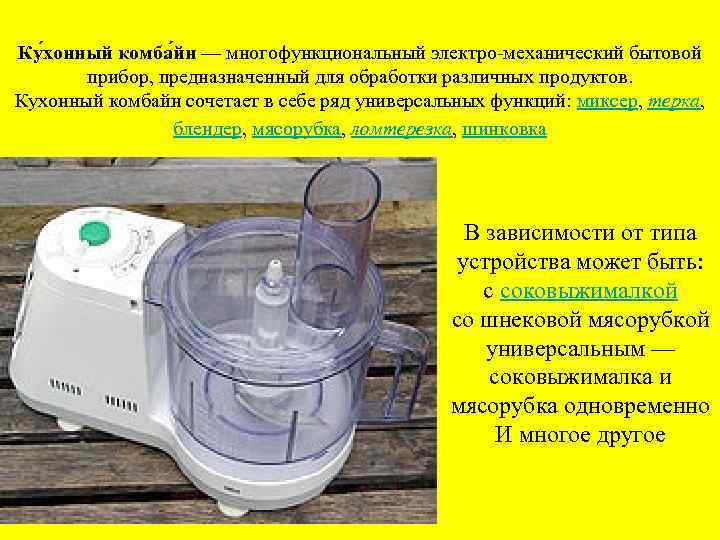 Ку хонный комба йн — многофункциональный электро-механический бытовой прибор, предназначенный для обработки различных продуктов. Кухонный комбайн сочетает в себе ряд универсальных функций: миксер, терка, блендер, мясорубка, ломтерезка, шинковка В зависимости от типа устройства может быть: с соковыжималкой со шнековой мясорубкой универсальным — соковыжималка и мясорубка одновременно И многое другое