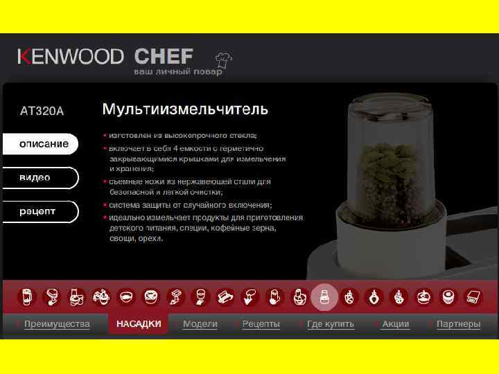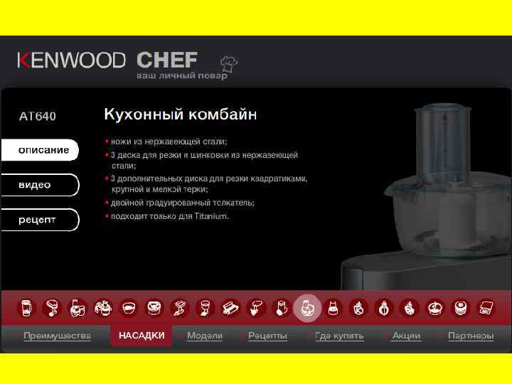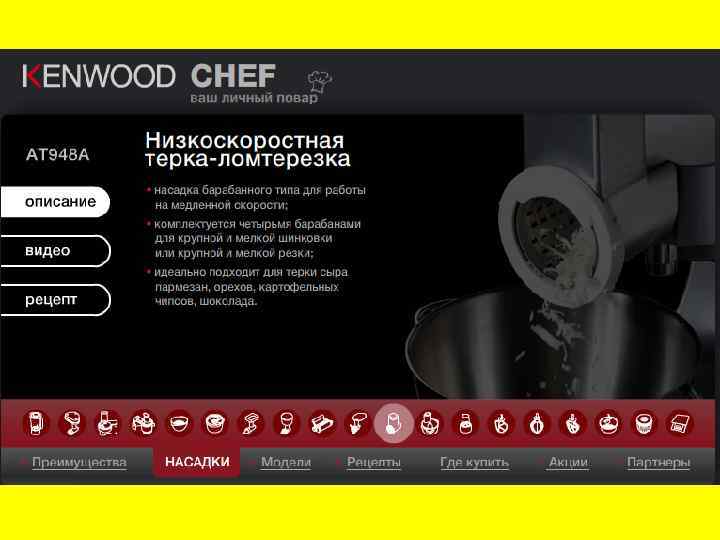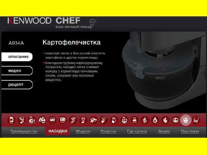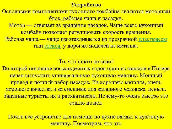 Устройство Основными компонентами кухонного комбайна являются моторный блок, рабочая чаша и насадки. Мотор — отвечает за вращение насадок. Чаще всего кухонный комбайн позволяет регулировать скорость вращения. Рабочая чаша — чаще изготавливается из прозрачной пластмассы или стекла, у дорогих моделей из металла. То, что никто не знает Во второй половине восьмидесятых годов один из заводов в Питере начал выпускать универсальную кухонную машину. Мощный привод и полный набор насадок. Из хорошего металла, очень хорошего качества и за смешные для западного человека деньги. Западные туристы их и расхватывали. Почему-то очень быстро это сошло на нет. Почти все устройство для помощи по кухне входят к кухонную машину. Посмотрим, что это