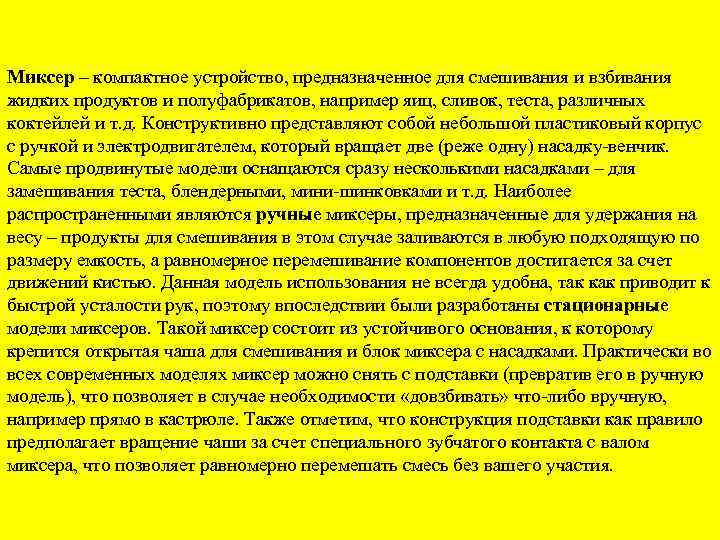 Миксер – компактное устройство, предназначенное для смешивания и взбивания жидких продуктов и полуфабрикатов, например яиц, сливок, теста, различных коктейлей и т. д. Конструктивно представляют собой небольшой пластиковый корпус с ручкой и электродвигателем, который вращает две (реже одну) насадку-венчик. Самые продвинутые модели оснащаются сразу несколькими насадками – для замешивания теста, блендерными, мини-шинковками и т. д. Наиболее распространенными являются ручные миксеры, предназначенные для удержания на весу – продукты для смешивания в этом случае заливаются в любую подходящую по размеру емкость, а равномерное перемешивание компонентов достигается за счет движений кистью. Данная модель использования не всегда удобна, так как приводит к быстрой усталости рук, поэтому впоследствии были разработаны стационарные модели миксеров. Такой миксер состоит из устойчивого основания, к которому крепится открытая чаша для смешивания и блок миксера с насадками. Практически во всех современных моделях миксер можно снять с подставки (превратив его в ручную модель), что позволяет в случае необходимости «довзбивать» что-либо вручную, например прямо в кастрюле. Также отметим, что конструкция подставки как правило предполагает вращение чаши за счет специального зубчатого контакта с валом миксера, что позволяет равномерно перемешать смесь без вашего участия.