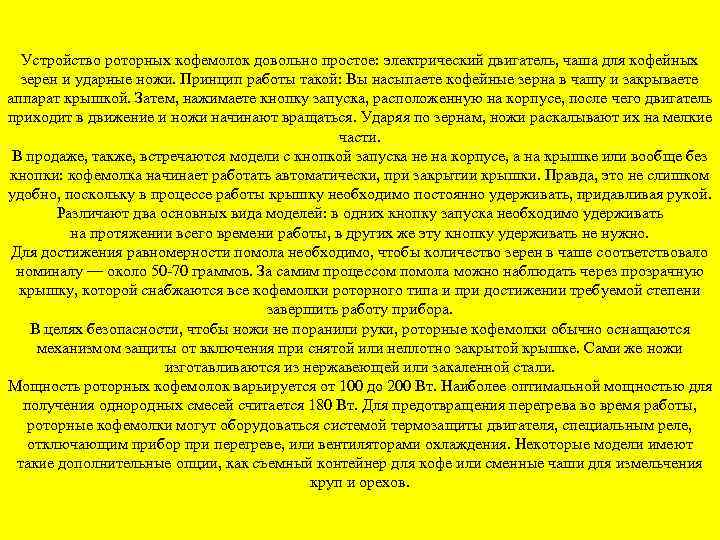 Устройство роторных кофемолок довольно простое: электрический двигатель, чаша для кофейных зерен и ударные ножи. Принцип работы такой: Вы насыпаете кофейные зерна в чашу и закрываете аппарат крышкой. Затем, нажимаете кнопку запуска, расположенную на корпусе, после чего двигатель приходит в движение и ножи начинают вращаться. Ударяя по зернам, ножи раскалывают их на мелкие части. В продаже, также, встречаются модели с кнопкой запуска не на корпусе, а на крышке или вообще без кнопки: кофемолка начинает работать автоматически, при закрытии крышки. Правда, это не слишком удобно, поскольку в процессе работы крышку необходимо постоянно удерживать, придавливая рукой. Различают два основных вида моделей: в одних кнопку запуска необходимо удерживать на протяжении всего времени работы, в других же эту кнопку удерживать не нужно. Для достижения равномерности помола необходимо, чтобы количество зерен в чаше соответствовало номиналу — около 50 -70 граммов. За самим процессом помола можно наблюдать через прозрачную крышку, которой снабжаются все кофемолки роторного типа и при достижении требуемой степени завершить работу прибора. В целях безопасности, чтобы ножи не поранили руки, роторные кофемолки обычно оснащаются механизмом защиты от включения при снятой или неплотно закрытой крышке. Сами же ножи изготавливаются из нержавеющей или закаленной стали. Мощность роторных кофемолок варьируется от 100 до 200 Вт. Наиболее оптимальной мощностью для получения однородных смесей считается 180 Вт. Для предотвращения перегрева во время работы, роторные кофемолки могут оборудоваться системой термозащиты двигателя, специальным реле, отключающим прибор при перегреве, или вентиляторами охлаждения. Некоторые модели имеют такие дополнительные опции, как съемный контейнер для кофе или сменные чаши для измельчения круп и орехов.